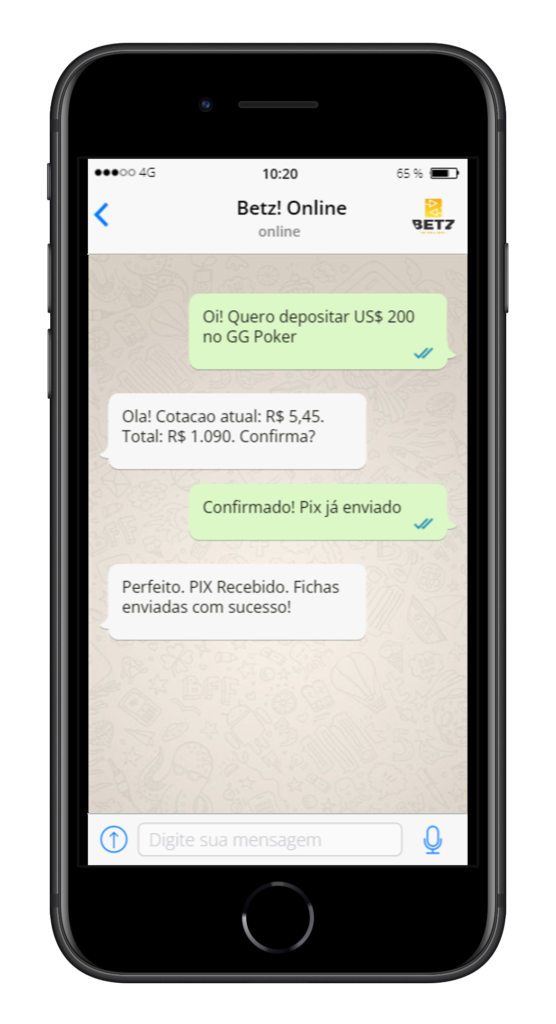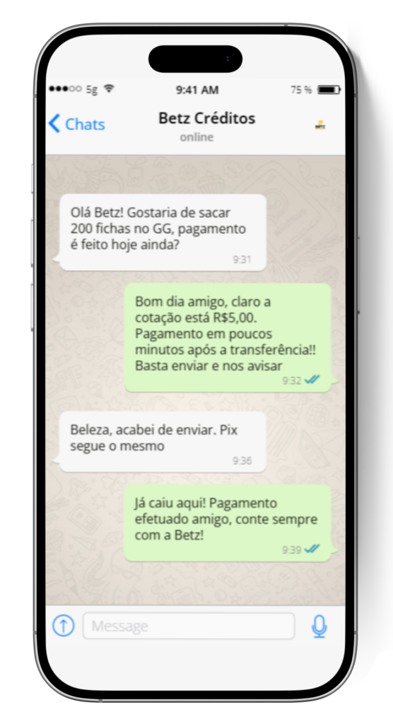 Entre em contato via WhatsApp informando a sala e o valor em fichas.
